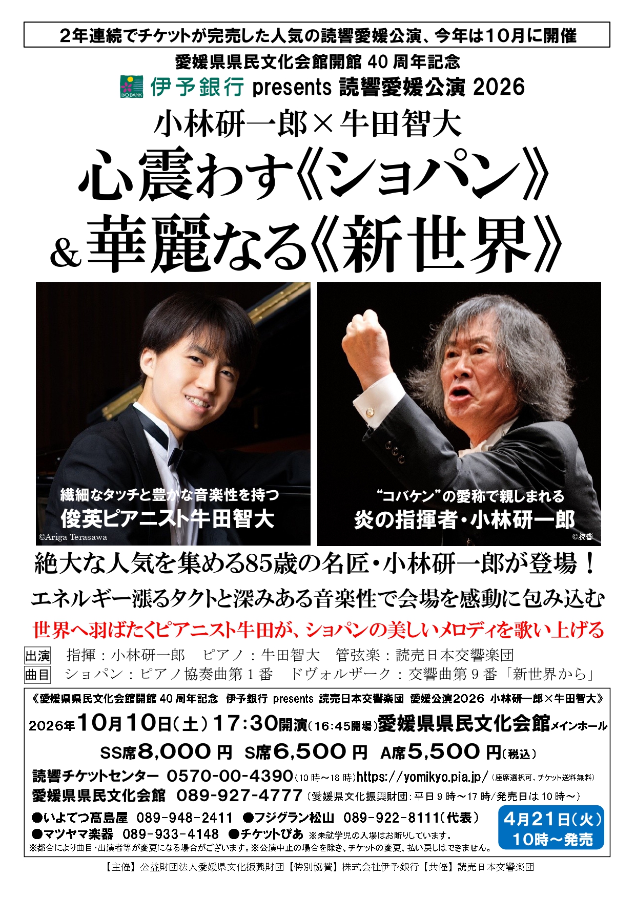 【プレイガイドご案内】愛媛県県民文化会館開館40周年記念 伊予銀行presents 読売日本交響楽団 愛媛公演2026 チケット発売について